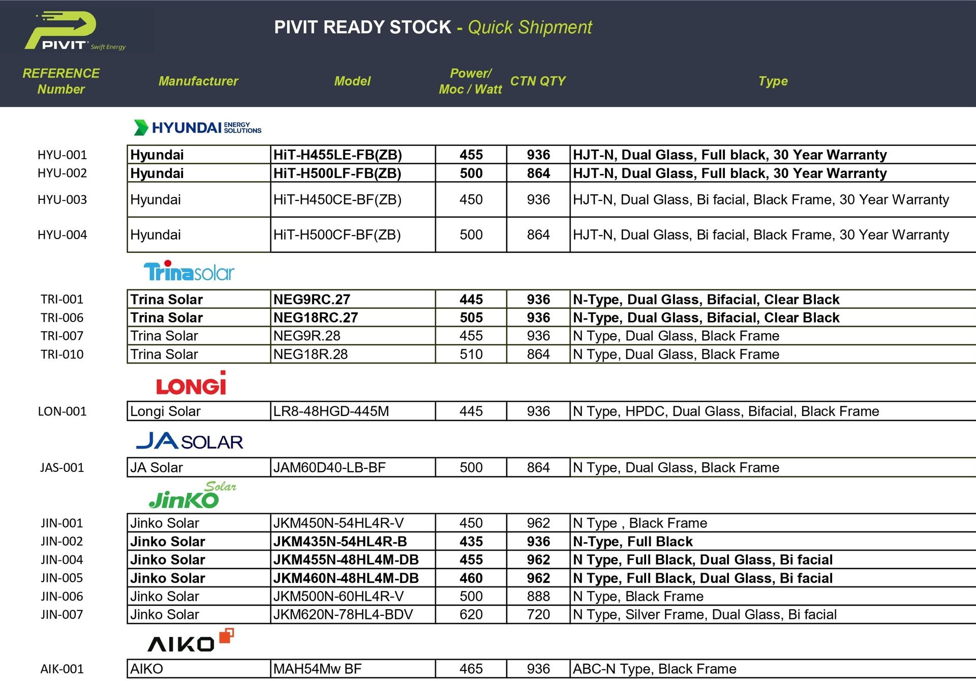 Hyundai, Jinko, Trina, Longi, AIKO, Canadian Solar, Risen, TW Solar, Ja Solar, Qn Solar, Zn Shine, Jolywood, Hanersun